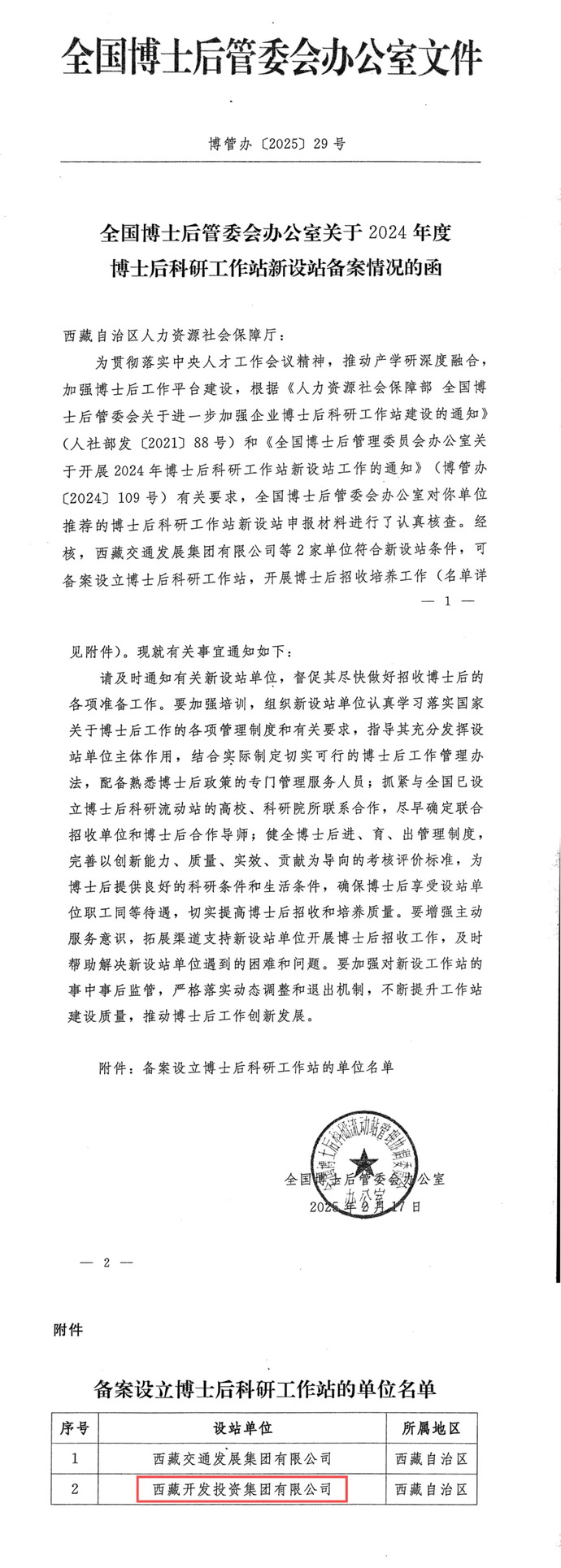 近日,全國博士后管委會(huì )辦公室公布了《關(guān)于2024年度博士后科研工作站新設站備案情況的函》,西藏開(kāi)投集團成功獲批設立博士后科研工作站,標志著(zhù)集團在科技創(chuàng )新和人才培養方面邁上新臺階,將為推進(jìn)集團清潔能源產(chǎn)業(yè)高質(zhì)量發(fā)展注入強勁動(dòng)力。