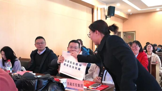 活動現(xiàn)場,一系列內(nèi)容豐富、形式新穎的環(huán)節(jié)有序開展。參會人員集中觀看了憲法精神主題影片及“憲法進(jìn)企業(yè)”主題紀(jì)錄片,直觀感受憲法的崇高權(quán)威與實踐力量;活動特邀西藏歐珠律師事務(wù)所律師歐珠永青作《憲法》專題講座,深入淺出解讀憲法核心要義與依法治企實踐路徑,充分闡釋了新時代《憲法》的新發(fā)展,引發(fā)廣泛共鳴;憲法趣味有獎問答互動環(huán)節(jié)氛圍熱烈,有效調(diào)動了干部職工學(xué)法用法的積極性;活動還設(shè)置了現(xiàn)場法律咨詢環(huán)節(jié),幫助干部職工解決工作生活中遇到的法律問題,號召大家爭做“學(xué)法先鋒、守法模范、用法表率”。