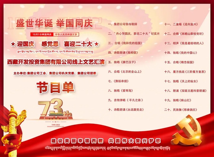 為迎接黨的二十大勝利召開(kāi),以良好的精神風(fēng)貌向祖國73周年華誕獻禮,9月30日,西藏開(kāi)投集團舉辦“迎國慶、感黨恩、喜迎二十大”主題線(xiàn)上職工文藝晚會(huì )。集團公司黨委書(shū)記、董事長(cháng)祁騰武出席活動(dòng)并致辭。集團公司領(lǐng)導班子成員劉剛、陳焱罡、羅布次仁、溫勇、鄧強、尼瑪出席活動(dòng)。