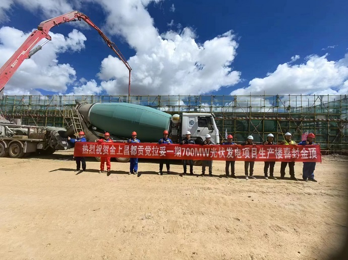 9月28日,隨著(zhù)生產(chǎn)樓屋面板最后一平方米混凝土澆筑完成,金上昌都貢覺(jué)拉妥一期700MW光伏項目生產(chǎn)樓順利封頂,項目參建單位辛苦勞作成果終于可以交上第一份答卷。