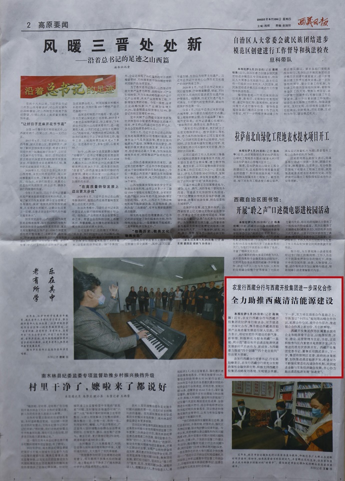 ?。ň幷甙矗段鞑厝請蟆?022年5月26日在第2版“高原要聞”欄目刊登文章,報道集團公司與農發(fā)行西藏分行銀企攜手全力助推西藏清潔能源建設。全文如下: