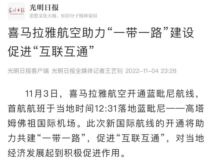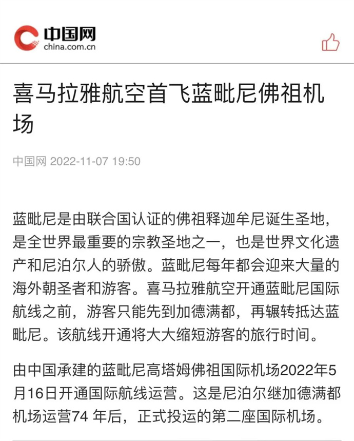 ?。ň幷甙矗?2022年11月4日至9日,中華網(wǎng)、中國網(wǎng)、中企網(wǎng)、中青網(wǎng)、中國日報網(wǎng)、光明日報、騰訊網(wǎng)、新浪網(wǎng)、搜狐網(wǎng)、今日頭條、中國旅游新聞網(wǎng)、中國西藏新聞網(wǎng)、拉薩新聞網(wǎng)、西藏生活網(wǎng)、西藏視窗、每日經(jīng)濟西藏、西藏途游網(wǎng)等媒體報道了《喜馬拉雅航空首飛藍毗尼佛祖機場(chǎng)》文章。摘要如下: