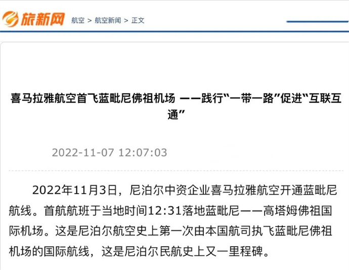 中華網(wǎng)、中國網(wǎng)、中企網(wǎng)、中國日報、光明日報、中國旅游新聞網(wǎng)、中國西藏新聞網(wǎng)、拉薩新聞網(wǎng)等媒體報道喜航開(kāi)通加德滿(mǎn)都至藍毗尼航線(xiàn)