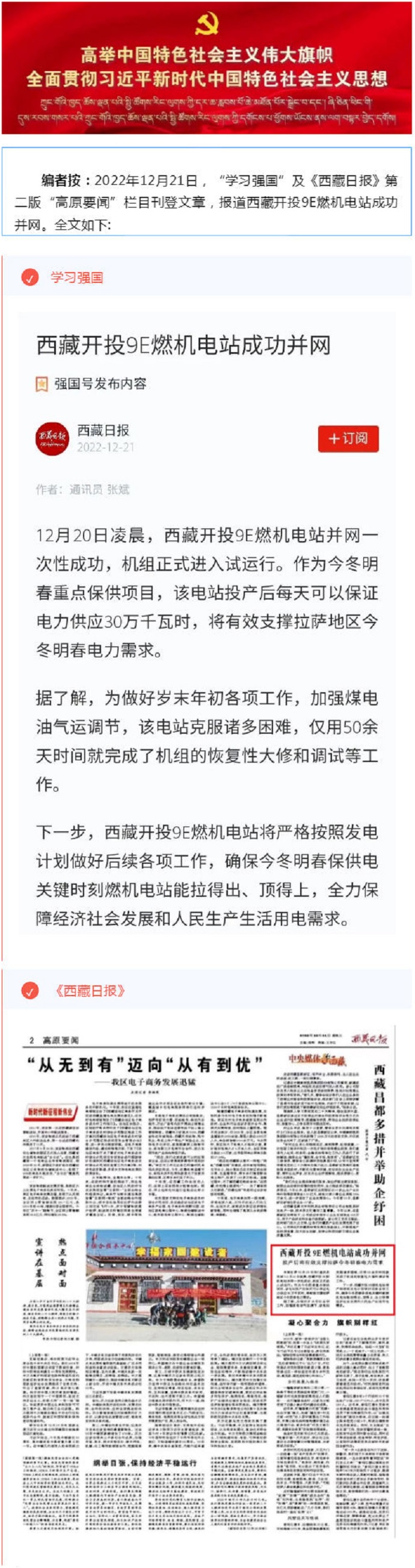 “學(xué)習強國”、《西藏日報》報道西藏開(kāi)投9E燃機電站成功并網(wǎng)