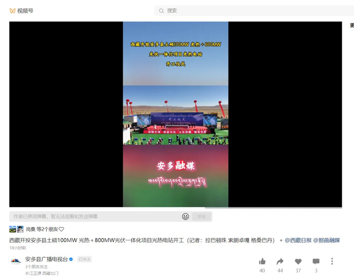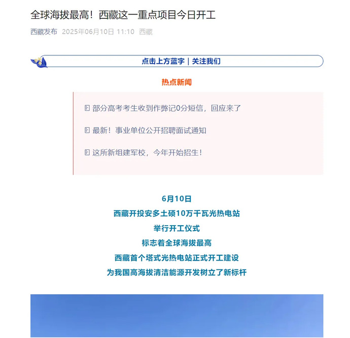 6月10日,全球海拔最高、西藏首個(gè)塔式光熱項目——西藏開(kāi)投安多土碩100MW光熱電站正式開(kāi)工建設的消息,被人民網(wǎng)、新華網(wǎng)、央視、光明日報、經(jīng)濟日報、科技日報、中國新聞網(wǎng)、中國西藏網(wǎng)、中國發(fā)展網(wǎng)、西藏發(fā)布、西藏日報、西藏廣播電視臺、西藏商報、安多縣廣播電視臺等各級媒體平臺宣傳報道,有力提升了集團品牌影響力和產(chǎn)業(yè)發(fā)展的傳播力。