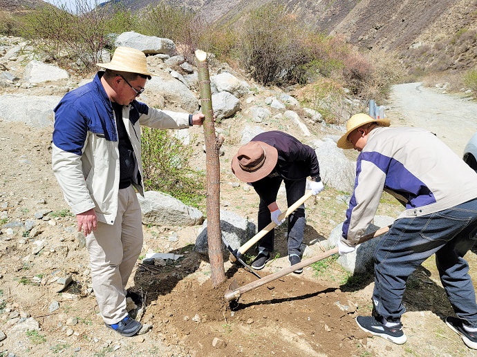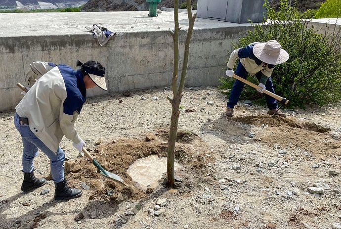 在燦爛的陽(yáng)光下,挖坑、扶苗、填土、踩實(shí)、圍堰、澆水……嘎堆水電公司全體干部職工個(gè)個(gè)干練嫻熟。雖然開(kāi)挖和取水都非常困難,但大家仍然熱情高漲,干勁十足,配合默契,共同播下今年的綠色心愿。