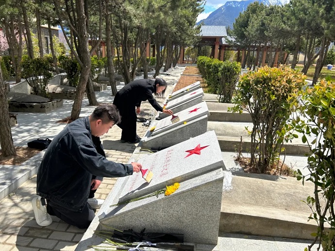 林芝市烈士陵園修建于1999年,共安葬烈士99名。這些革命烈士是在和平解放西藏、民主改革、中印自衛反擊戰及社會(huì )主義建設時(shí)期,為保衛國家和人民生命英勇?tīng)奚?,為解放和發(fā)展西藏、保衛邊疆、建設林芝做出了不朽的功勛,獻出了寶貴的生命。干部職工帶著(zhù)對烈士們無(wú)限的緬懷和追思,在烈士墓葬區向各個(gè)革命時(shí)期英勇?tīng)奚牧沂烤传I花束,并清掃了墓碑。