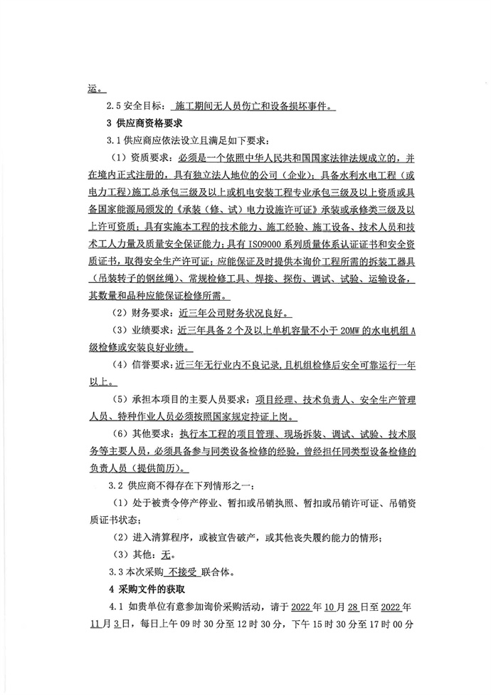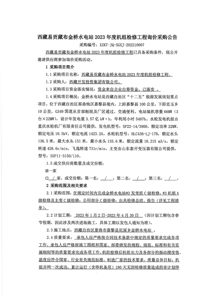 西藏易貢藏布金橋水電站2023年度機組檢修工程詢(xún)價(jià)采購公告