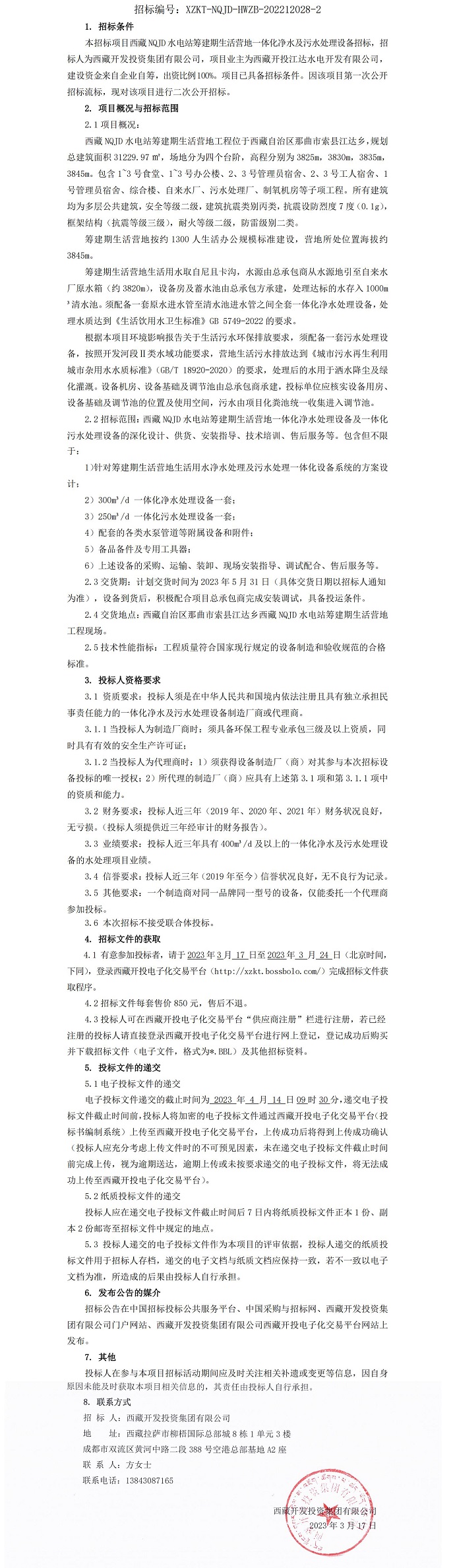 西藏 NQJD 水電站籌建期生活營(yíng)地一體化凈水及污水處理設備招標公告