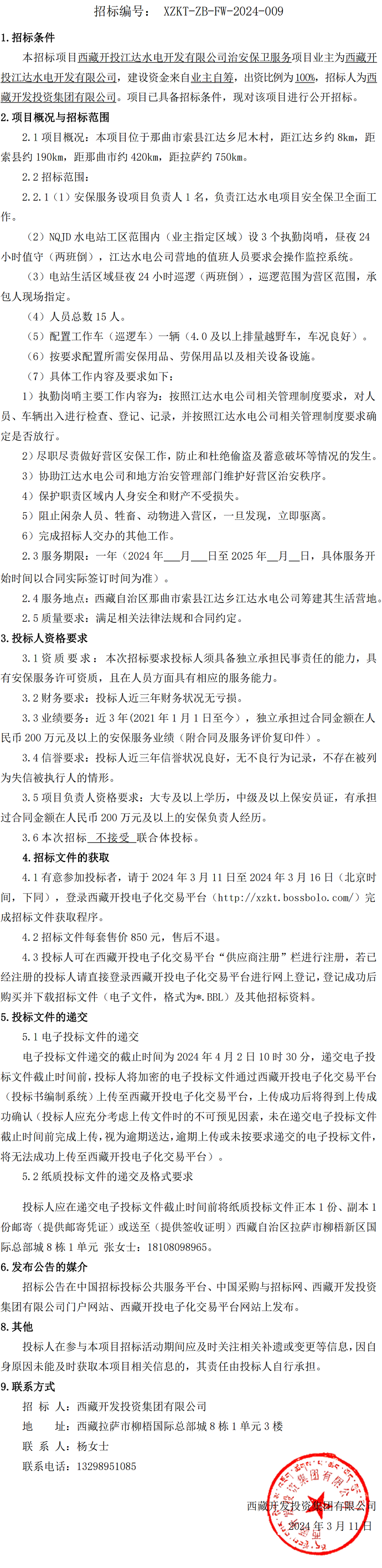 西藏開(kāi)投江達水電開(kāi)發(fā)有限公司安保服務(wù)招標公告