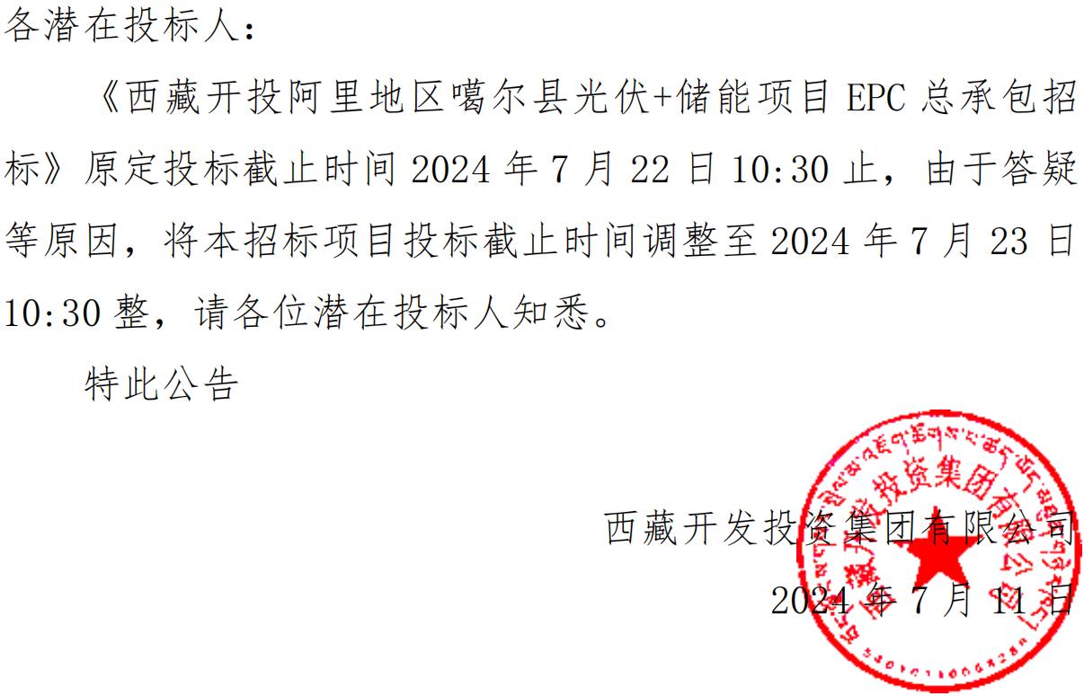 關(guān)于延長(cháng)《西藏開(kāi)投阿里地區噶爾縣光伏+儲 能項目 EPC 總承包招標》投標截止時(shí)間的公告