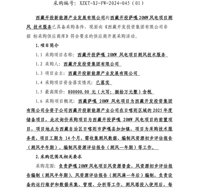 西藏開(kāi)投薩嘎20ML風(fēng)電項目測風(fēng)技術(shù)服務(wù)詢(xún)價(jià)采購公告(第二次)