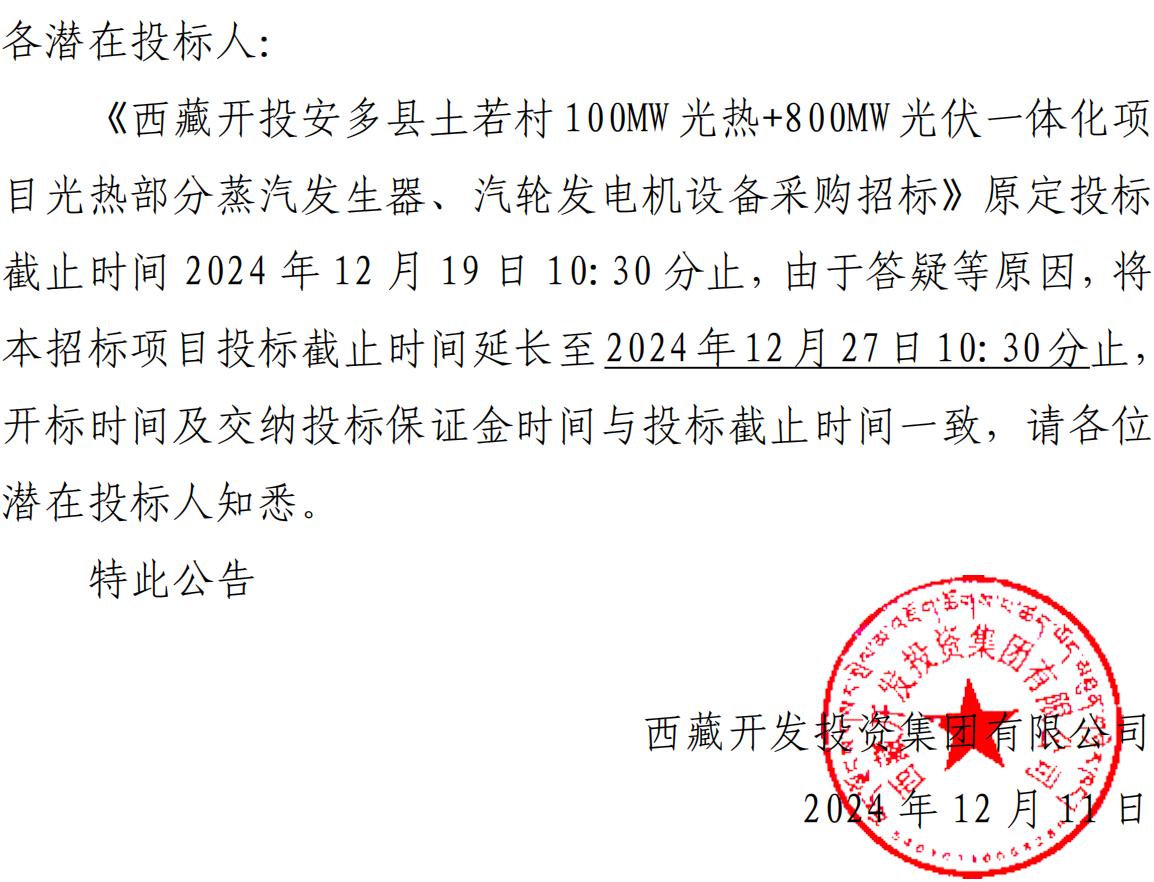 關(guān)于延長(cháng)《西藏開(kāi)投安多縣土碩 100MW 光熱+800MW 光伏一 體化項目光熱部分蒸汽發(fā)生器、汽輪發(fā)電機設備采購招標》投 標截止時(shí)間的公告
