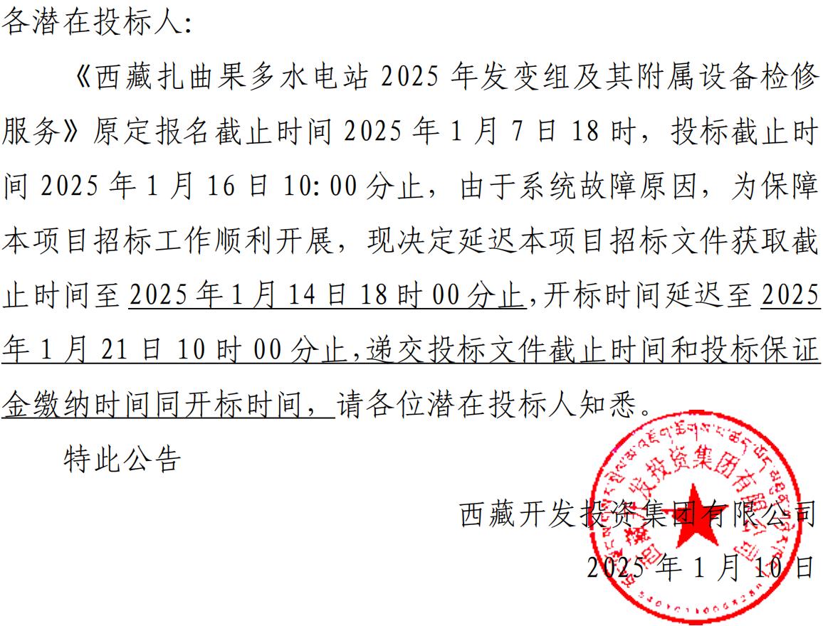 關(guān)于延長(cháng)《西藏扎曲果多水電站 2025 年發(fā)變組及其附屬設備檢修服務(wù)》報名及投標截止時(shí)間的公告